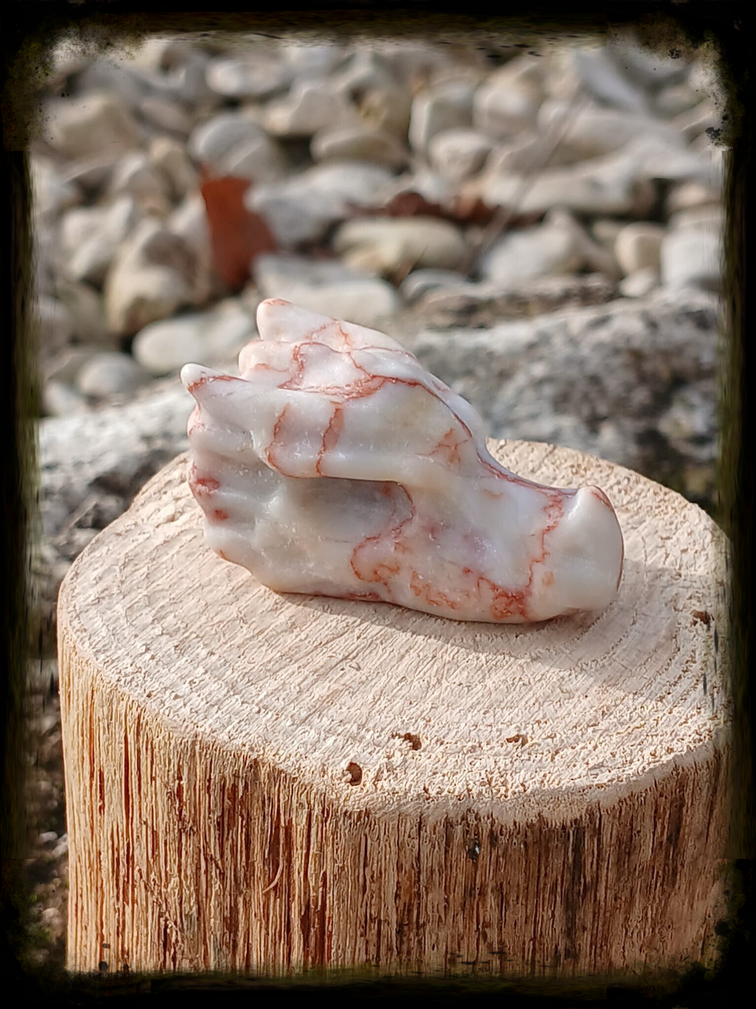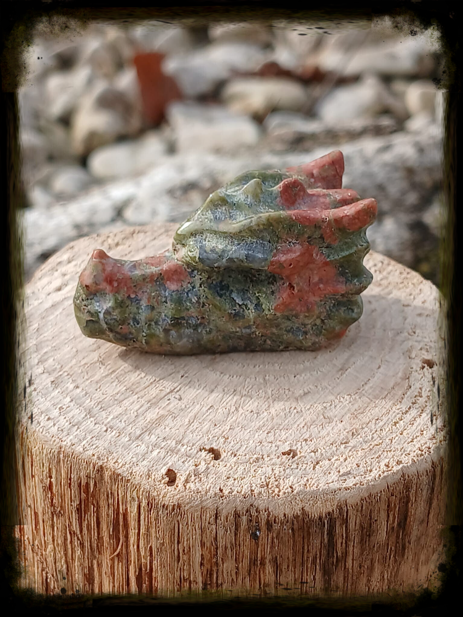 Drakenschedels van: rode Calciet,Pyriet en Unakiet.