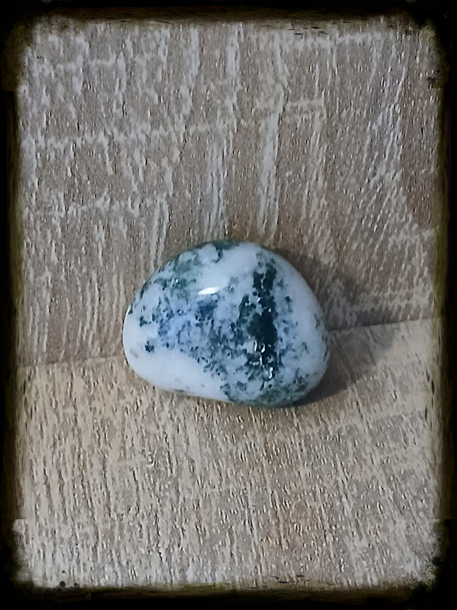 Agaat-soort met groene en witte patronen,die op bladeren lijken; deze Agaat-variant helpt je om schoonheid in alles te zien en is goed voor de kweek en bloei van planten! Spiritueel:Is deze steen erg rustgevend en helpt hij bij:shock,trauma's en kwesties die te maken hebben met het ego.