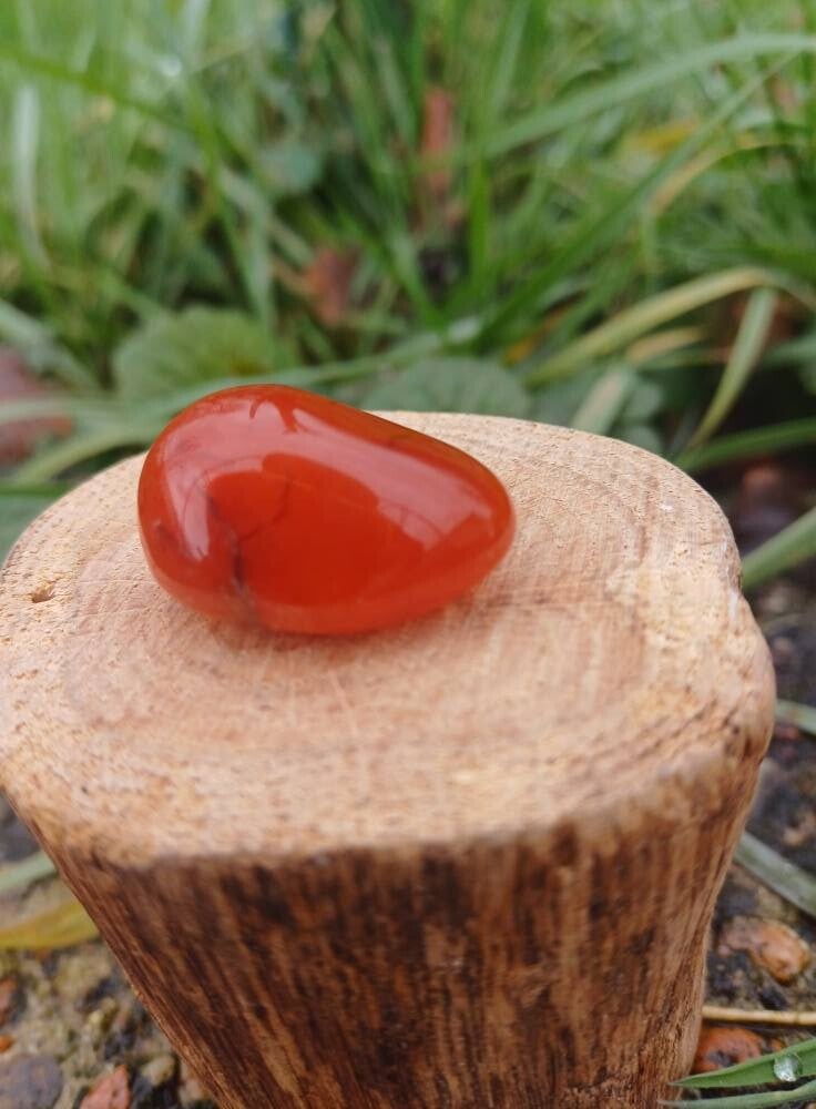 Een oranje/rode chalcedoonvariant;die verbonden staat met de sacraal chakra en de sterrenbeelden:stier,kreeft en leeuw.Dit is een steen die:je weer lekker in je vel laat zitten, helpt bij het studeren en het spreken voor een publiek. Lichamelijk:vermindert Carneool dorst,is hij goed voor de spijsvertering,weefselherstel,galblaas,nieren.Bevordert de eetlust en brengt vitaliteit en bestrijdt:eetstoornissen,astma,hooikoorts,verkoudheden,bronchitis,infecties,zenuwpijn en is goed voor de behandeling van snij-en schaafwonden. Spiritueel:versterkt Carneool je band met de geestenwereld en laat je het verband zien tussen:ziekte en emotie;zodat je je emoties kan aanpakken en zo ziekte kunt voorkomen!Verder helpt hij bij het bestrijden van een reeks negatieve emoties zoals bv.boosheid,jaloezie,angst en afgunst.